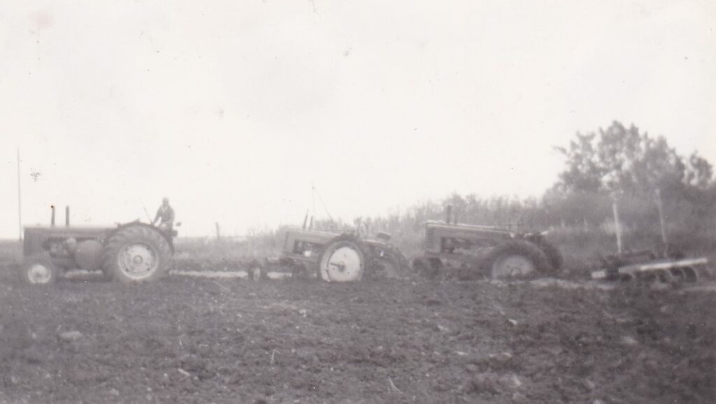 Tractors and a sugar beet digging machine stuck in deep mud during sugar beet harvesting in the late 1940’s.